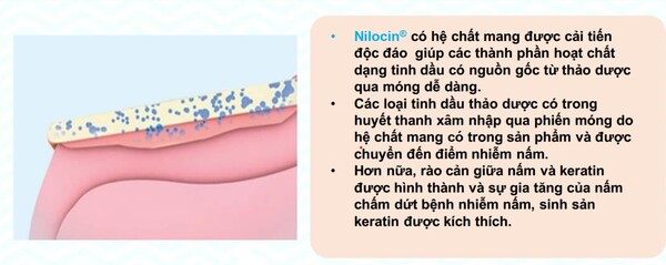 - Công thức Chất vận chuyển kết hợp với hoạt chất sẽ thâm nhập và hấp thụ vào móng ngay lập tức và hoạt động bằng cách loại bỏ các điều kiện sống của nấm. Do cấu trúc phân tử của chất lỏng Nilocin, và sự hấp thụ vào các vết đào và kẽ, nấm móng bị ngăn cản phát triển về mặt vật lý.