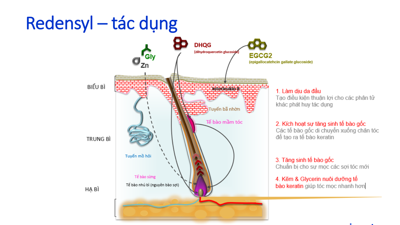 Redensyl giúp bảo vệ, phục hồi và nuôi dưỡng tế bào gốc nang tóc. Giúp tóc mới mọc lại chắc khỏe hơn. Như vậy Redenyl giúp giảm rụng tóc và kích hoạt tế bào mầm tóc, kích thích sự mọc tóc. Hãy áp dụng các cách nêu trên để vượt qua được chứng rụng tóc do stress bạn nhé.