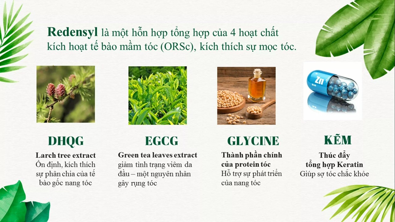 Thứ 2: Redenyl có chứa Redensyl - là hợp chất tổng hợp từ thiên nhiên - được cấp bằng sáng chế - kích hoạt tế bào mầm tóc, kích thích sự mọc tóc.