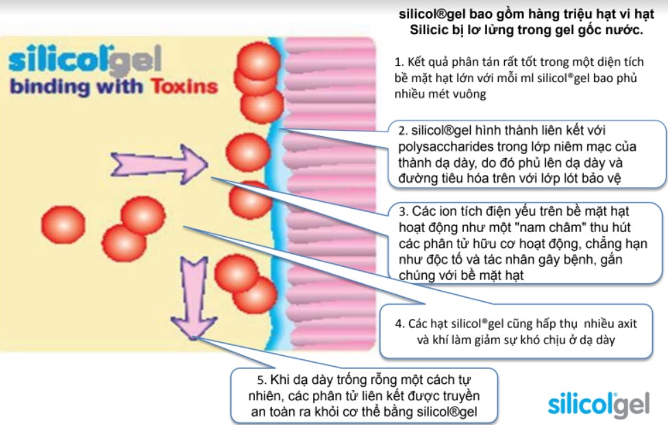 - Với đặc tính hấp phụ, chúng hoạt động như các hạt nam châm hút các tác nhân gây hại như chất kích thích, mầm bệnh, độc tố, gắn kết chúng với gel. Đồng thời hấp thu lượng khí và acid dư thừa.