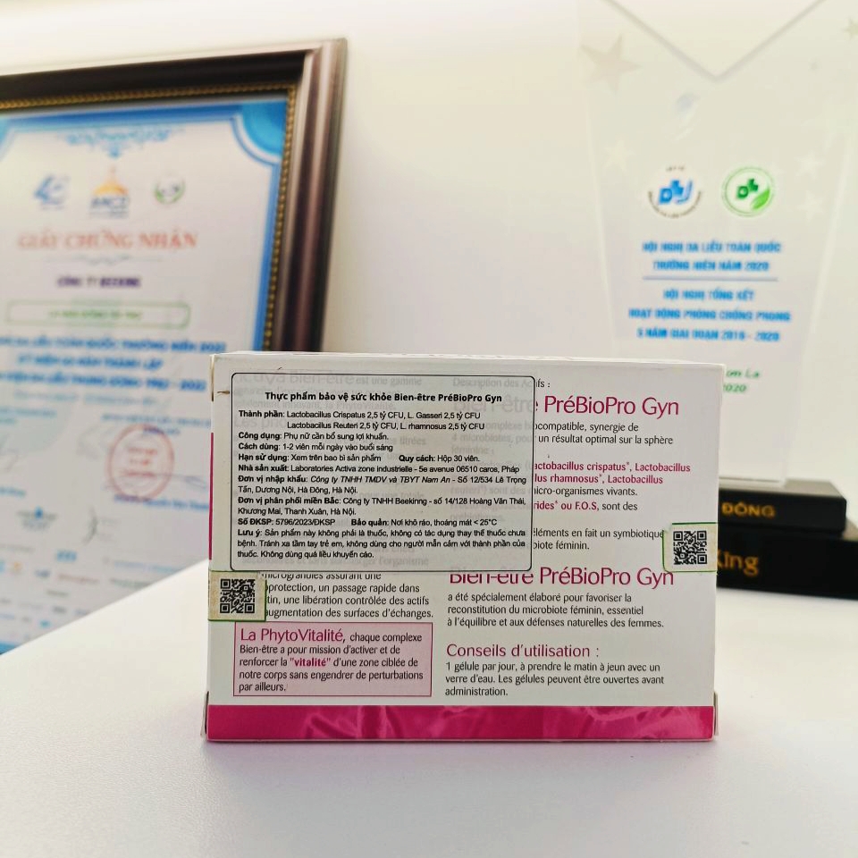 Thực phẩm bảo vệ sức khỏe Bien-etre Prebiopro Gyn (Activa Prebiopro Gyn) là sản phẩm chăm sóc sức khỏe chuyên biệt dành riêng cho phụ nữ đến từ thương hiệu Activa số 1 tại Pháp, cung cấp 10 tỷ lợi khuẩn trên mỗi viên nang, từ đó giúp ngăn các vi khuẩn gây bệnh và bảo vệ sức khỏe vùng kín. Sản phẩm hoàn toàn an toàn và phù hợp cho phụ nữ đang trong thời kỳ mãn kinh, cũng như phụ nữ mang thai và đang cho con bú.