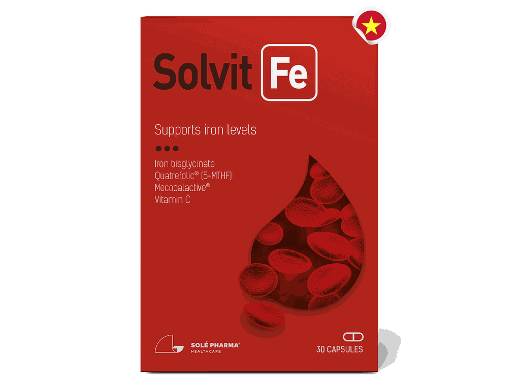 3. Bộ tạo máu hoàn chỉnh, đúng sinh lý: Fe + B9 + B12 + Vitamin C Solvit Fe không chỉ “bổ sung sắt”, mà xử lý đúng cơ chế thiếu máu. B9 (5-MTHF) + B12 (methylcobalamin) → hỗ trợ tạo hồng cầu Vitamin C từ quả sơ ri → tăng hấp thu sắt